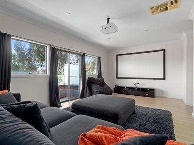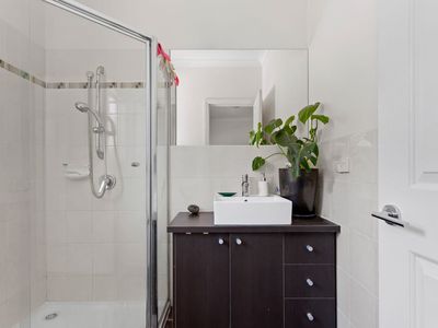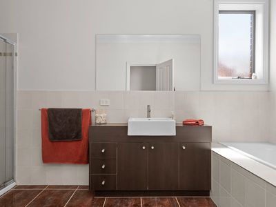 Up and downstairs, you'll find the spacious bedrooms, each with built-in robes. The master bedroom features a walk-in robe and ensuite bathroom. The additional bathrooms are modern and well-appointed, catering to the needs of a busy family.
