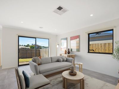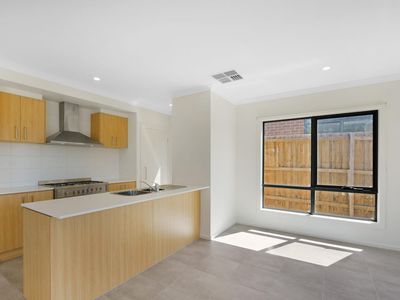 At the heart of the home, the open-plan kitchen, dining, and living zone provides the perfect setting for everyday living and entertaining. The modern kitchen features quality appliances, excellent storage, and a breakfast bar for casual meals.